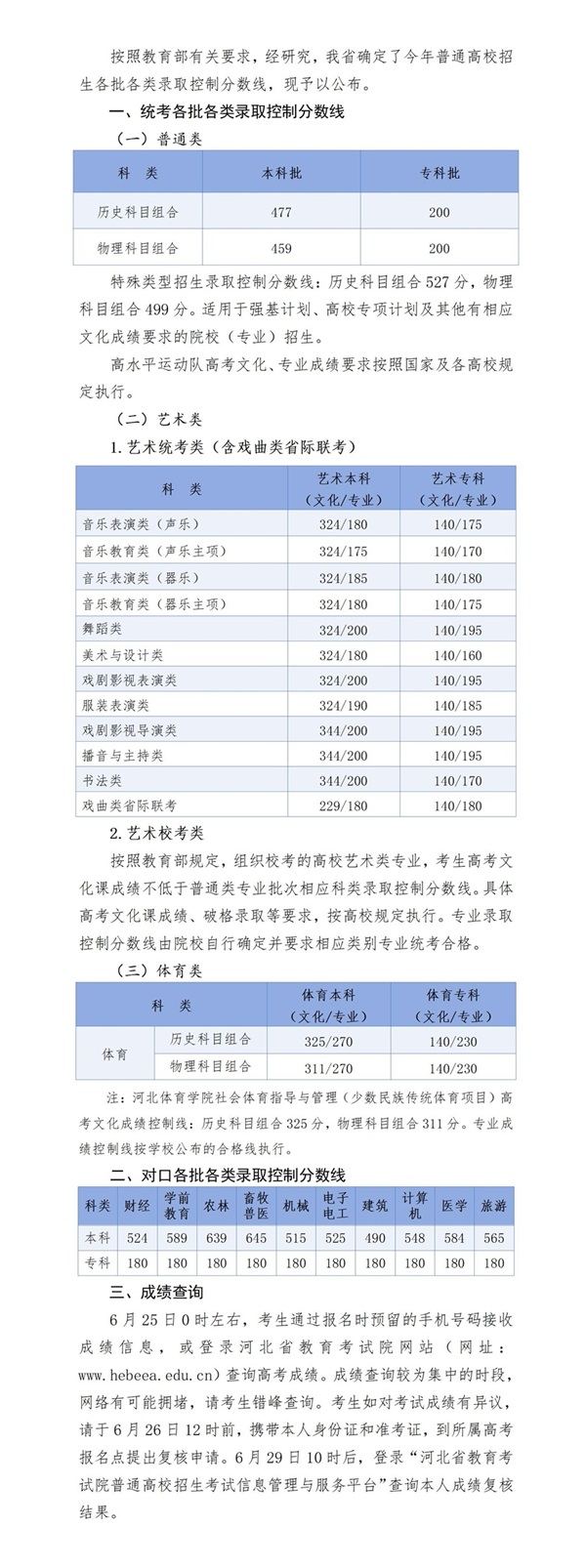 2025年河北省普通高校招生各批各类录取控制分数线
